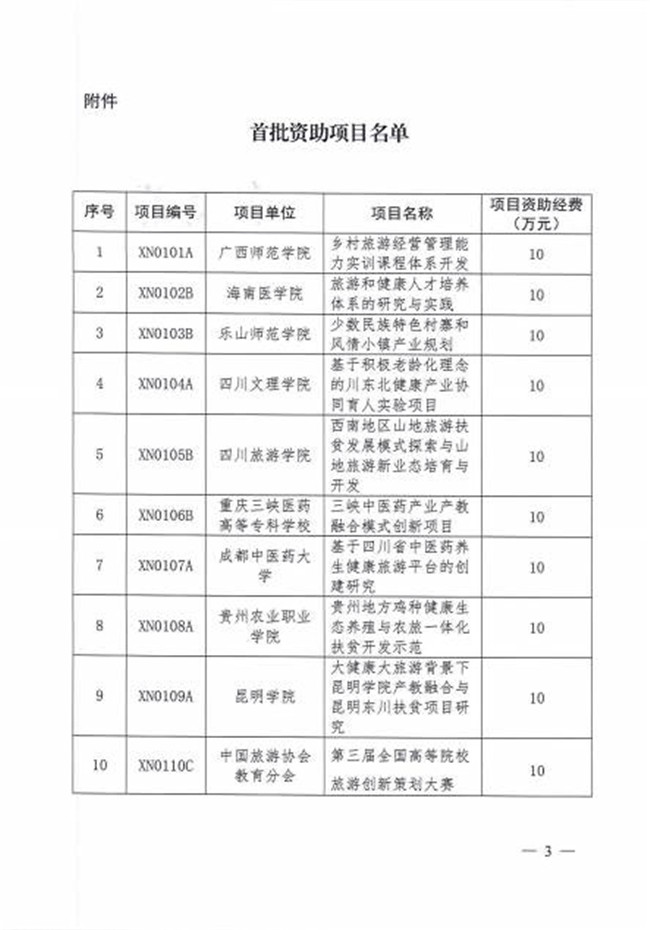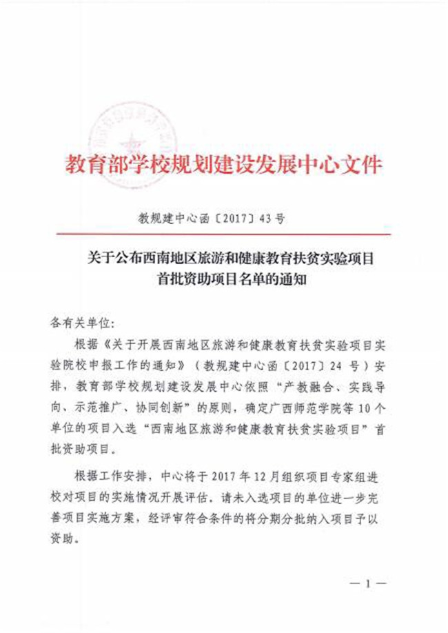 日前,根据教育部学校规划建设发展中心下发的《关于公布西南地区旅游和健康教育扶贫实验项目首批资助项目名单的通知》(教规建中心函〔2017〕43号),我校申报的《少数民族特色村寨和风情小镇旅游产业规划》项目在此次遴选中成功入选。