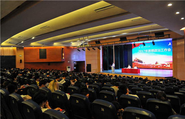 全体校领导、处科级干部、副处级后备干部,宣传部、学生处、校团委全体工作人员,全体辅导员,马克思主义学院全体教师、其他各学院教师代表、学生代表,图书馆、后勤集团优秀员工代表,教职工党支部、学生党支部书记共近580人参加会议。