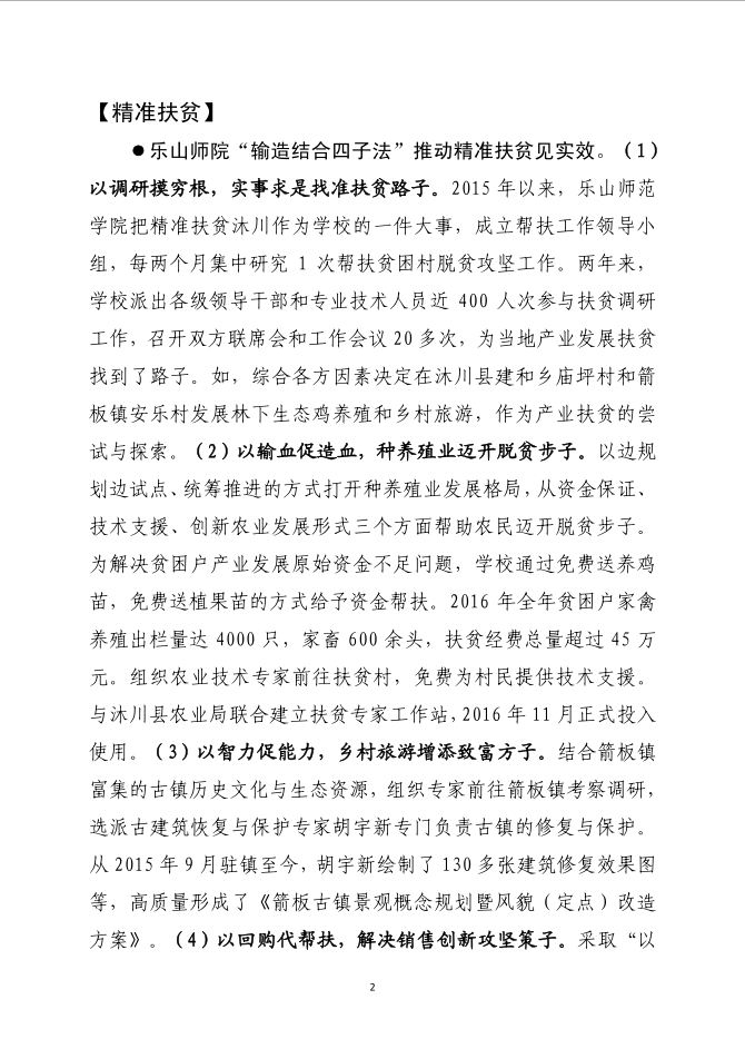 2015年以来,我校把精准扶贫沐川县作为学校的一件大事,充分利用学校智力人才优势,坚持输血与造血相结合,深入沐川贫困农户查贫情寻路子、结地情找方子、依校情添策子、提能力开步子,探索出一条符合校情、地情、民情实际的扶贫之路。下一步,我校将聚焦沐川脱贫阶段性任务和定点贫困村民需求,坚持“输造结合”,坚持项目支撑,通过改造生态养殖环境、规范养殖质量标准打造沐川生态乌骨鸡地方名优农产品,推进“互联网+林下生态养殖”平台建设,解决销售渠道问题,实施乡村旅游规划建设,发展休闲农业,让贫困村民走上勤劳致富之路。