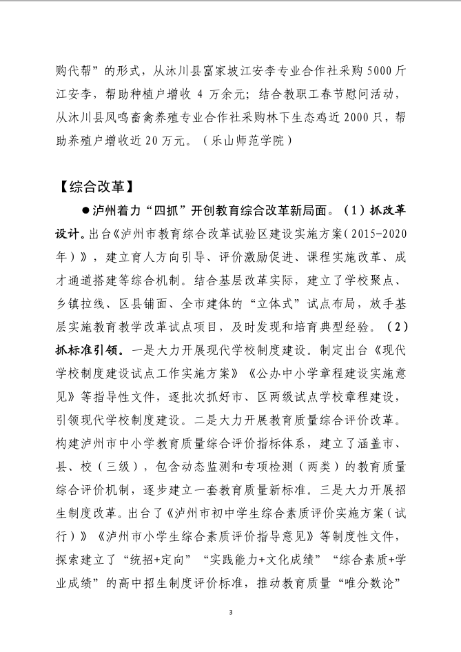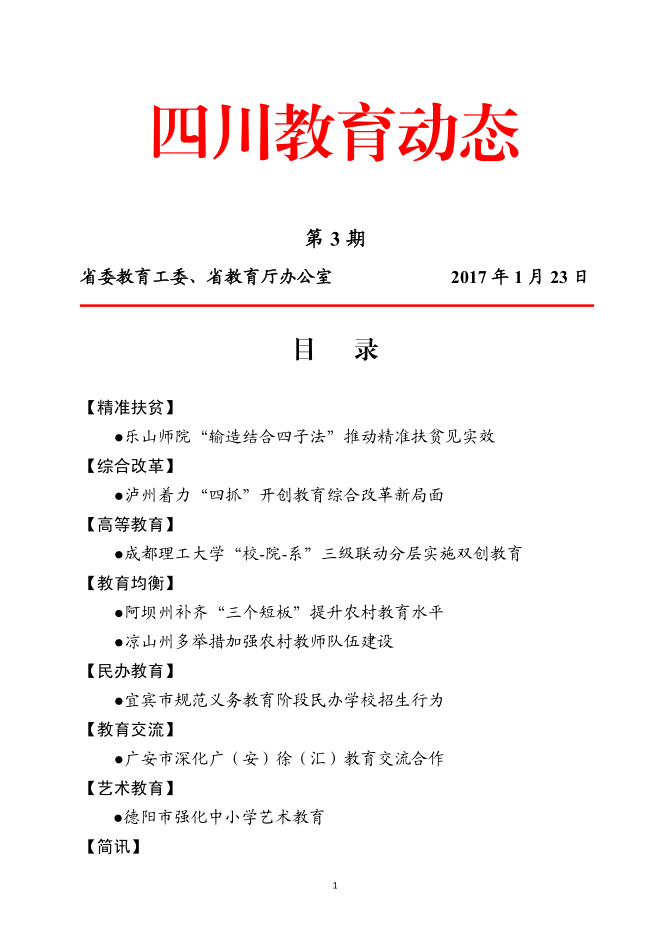 寒假期间,四川教育动态刊登了我校选送的名为“乐山师院‘输造结合四子法’ 推动精准扶贫见实效”一文(四川教育动态2017年1月23日 第3期),专栏报道我校精准扶贫创新模式,充分肯定了我校在精准扶贫重大举措上取得的成果。