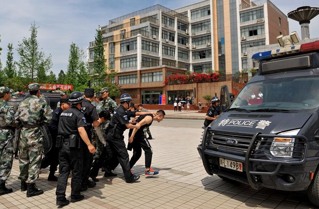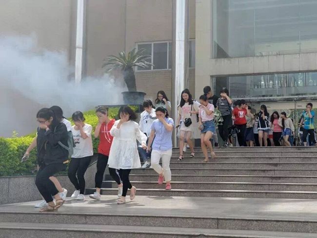 14时40分,行知楼广场发生聚众斗殴和围攻冲击教学楼事件,正在执勤的校卫队员迅速赶到现场阻止,由于事态严重,第一时间通过对讲机向指挥部报告并拨打110电话报警。学校预备役应急分队接到指令后迅速集结,赶赴现场按盾牌防暴队列进行初起处置,控制事态发展。乐山市公安局接到警情后,迅速调遣警力赶赴行知楼广场处置并带离涉嫌犯罪人员。至此,2017年应急疏散演练各科目圆满完成。