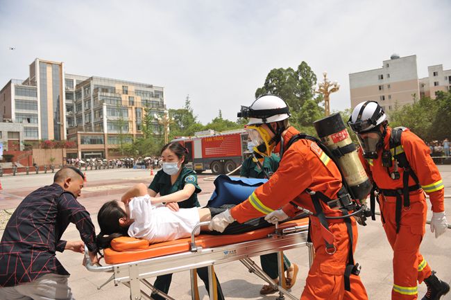 14时33分,行知楼突然发生“火灾”,现场浓烟滚滚,多名师生被困。警报拉响,全校各部门按照应急预案立即进入应急工作状态,参演师生按照疏散路线迅速有序向避险集结地撤离。接到报警后,市公安消防支队立即出动抢险救援车、水罐消防车及十余名消防官兵赶赴现场“施救”。到达现场后,消防官兵立即拉起警戒,展开火情侦察、铺设水带干线,设置水枪阵地,按制“火势”蔓延。搜救小组携带救援装备在水枪的掩护下进入“着火”大楼,两名“被困人员”成功获救,由乐山市市中区中医院医护人员进行紧急施救,并将受伤较重的伤员抬上救护车护送到医院。约6分钟后行知楼“火情”被成功处置。