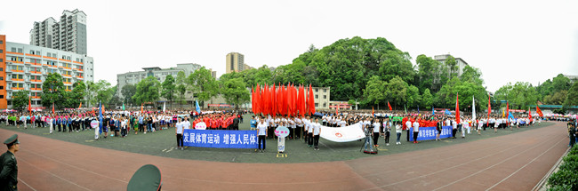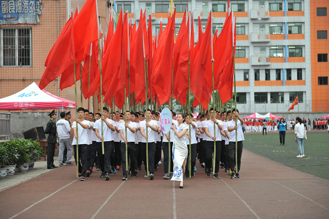 在春意盎然、鸟语花香的人间最美四月天,田径场上彩旗迎风飘扬,整齐划一的学院代表方队在激昂的音乐声中依次入场,接受全校师生的检阅。“此刻,向我们走来的是本次运动会的公平使者——裁判员队伍……”主持人刚强有力的声音伴着激昂的音乐穿透了整个运动场。裁判员队伍身着红色运动服,迈着整齐划一的步伐坚定的走过主席台,他们将用手中的秒表和量尺全心全意为赛事护航。“学校的发展离不开他们的热忱奉献、学生的成长离不开他们的默默耕耘”,80名教职工代表队身着黑色运动服大步向前,展现着“团结、和谐、奋发、进取”精神。踏着音乐,各学院代表队以饱满的热情和激昂的斗志,迈着稳健的步伐、喊着嘹亮的口号依次走向主席台。