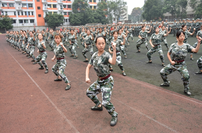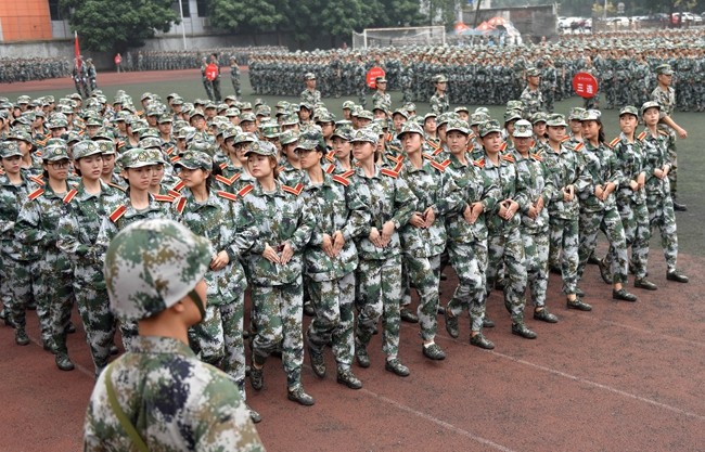 大会在《中国人民解放军军歌》中拉开帷幕。阅兵分列式上,军训团5个营25个连队排着整齐的方队,依次通过主席台,他们踏着整齐的步伐、喊着嘹亮的口号、气势昂扬的接受着领导的检阅。女生连队的军体拳表演,掷地有声、英姿飒爽,打出了巾帼不让须眉的气势,展示了既爱红妆更爱武装的风采。25个连队的学员代表在规定时间内按照横平竖直、棱角分明的标准,进行了叠军被表演。