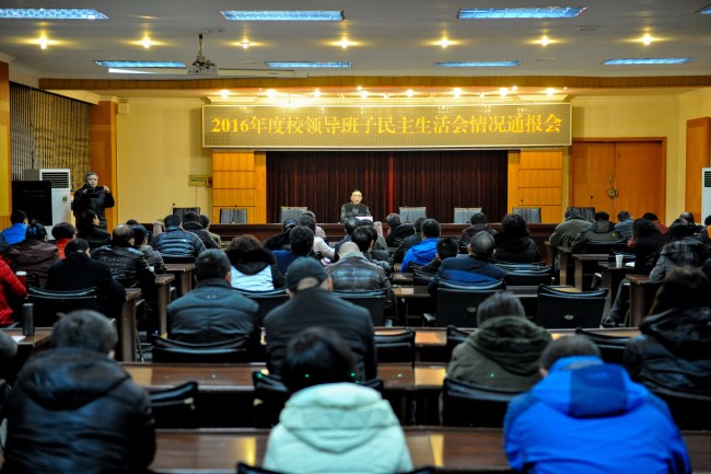 1月20日上午9:00,学校在弘毅楼第一会议室召开了2016年度校领导班子民主生活会情况通报会。全体校领导,机关职能部门负责人,教学单位党政负责人,省市人大代表、政协委员代表,教代会执委代表,民主党派负责人代表,学科带头人代表,学术骨干代表,青年骨干教师代表,党代表等参加了会议。校党委书记杨胜宽主持会议并作情况通报。