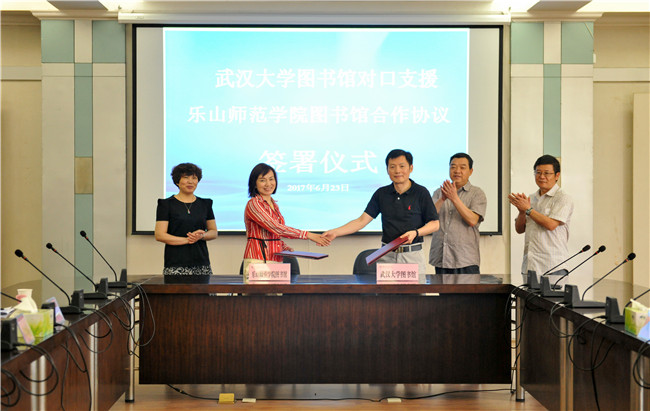 王新才对乐山师范学院校领导、图书馆领导以及图书馆业内的各位同仁表示感谢,他介绍了武汉大学图书馆图书情报资源建设等情况,希望以合作共建协议签订为平台,继续加强两馆联系,推动合作交流进一步深化。张静对武汉大学图书馆近年来对我馆的支持与帮助表示衷心的感谢。她介绍,目前我校图书馆已派出5人次业务馆员赴武汉大学图书馆进行跟岗学习培训,未来将继续做好双方人员的互动交流工作。为落实好合作共建协议,两校将成立协作小组,负责开展合作,促进相关业务联络、宣传、咨询等。随后,王新才与张静签署了合作共建协议。根据协议,两校将在资源共享、人才培训、学术交流等方面开展一系列的共建合作。