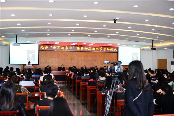 醉美四月好春光,花香袭人伴书香。为纪念“4.23”世界读书日,推进“书香校园”阅读推广工作,4月27日下午,我校第六届读书节启动仪式在图书馆五楼学术报告厅隆重举行。学校副校长杜学元、超星集团西南地区总经理赵志勇、宣传部部长佘万斌、学工部副部长丁敏娜、图书馆直属支部书记吉仕梅、副馆长刘子金、全校一、二年级各班学习委员、“十佳阅读之星”、“十佳书香班级”代表以及图书馆阅读推广小组成员等200余人参加了本次启动仪式。