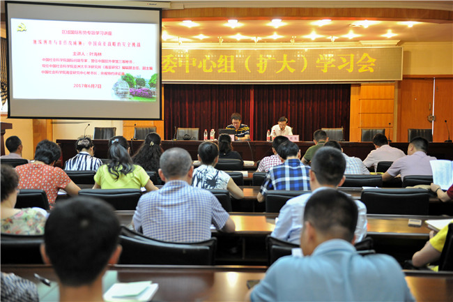 6月7日下午4:00,我校在弘毅楼第三会议室召开党委中心组(扩大)学习会。会议邀请中国社会科学院国际问题专家、央视特约评论员叶海林先生作专题讲座。全体在家校领导、处级干部,马克思主义学院专任教师,跨喜马拉雅旅游文化研究中心负责人,老挝研究中心负责人参加学会议。校党委书记杨胜宽主持会议。
