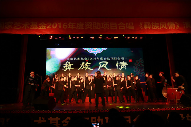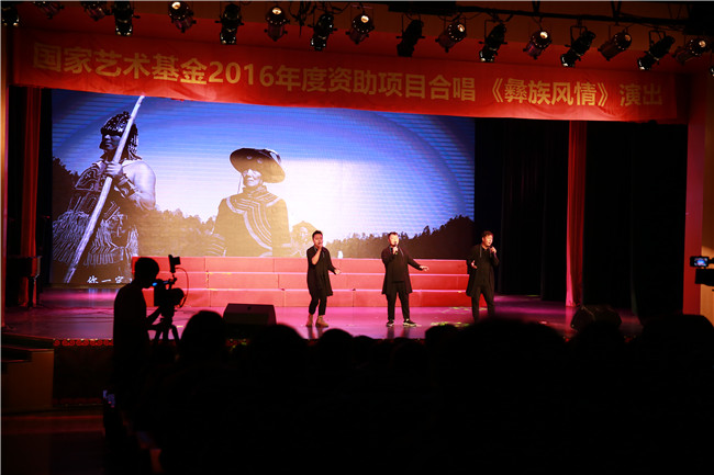 当晚的多功能厅华灯璀璨,座无虚席。整个音乐会以无伴奏合唱《彝族风情》为主,表演直接以彝语演唱,采用无伴奏合唱形式。作品的音乐和歌词具有非常浓郁的彝族原生态文化艺术特色。该作品借用了西洋音乐的织体、和声以及复调等作曲手法,进一步丰富和增强了原生态音乐旋律的艺术魅力,形象地表现了彝族地区人民丰富多彩的文化和生活场景。