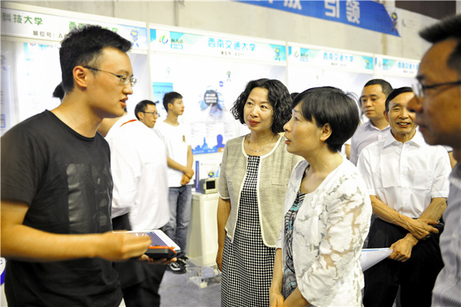 会后,组委会成员和团省委书记刘会英、乐山市副市长郭捷、我校党委书记杨胜宽、校长胡丹等领导一同参观了参赛作品路演。