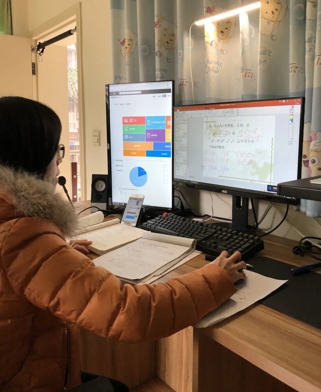 因为疫情在家的原因,同学们一开始手里大多没有教材,虽然有些学生网购了教材,但黄宽娜老师还是考虑到部分同学没有教材的问题。她说,“课堂教学的时候我的课件是比较简练的,很多推导都会在黑板上进行。”但直播教学的时候,为了确保同学们能够理解和及时复习,像《数学竞赛》这门课程,黄宽娜老师会准备两套课件,在线直播的时候同课堂教学一样用简洁的版本,并结合电子教鞭的写写画画演示推导过程。“我会利用喀秋莎软件将整个直播过程录制下来,并对原视频进行编辑,剪辑掉一些直播中一些口误之类的的片段,然后生成新的视频后再上传平台,方便班上学生回看和复习。”黄宽娜老师课后还会根据课堂上教学的实际情况将课件补充详细后再发给学生。