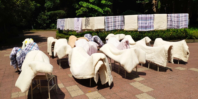 记者在女生苑看到,宿管阿姨黄旭芳、王健、陈秀容、古建军正在晾晒棉被,一共有230床,这些棉被在院子里整整齐齐,一圈一圈地排开,蔚为壮观。百1幢管理员陈英说:“这个工作还是挺辛苦的,我们从楼上把棉被一床床抱下来,再把钢木结构的凳子一一搬出来,擦拭干净,用凳子晾晒棉被,晾晒完再把凳子和棉被搬回每一间寝室,是个体力活呢。”