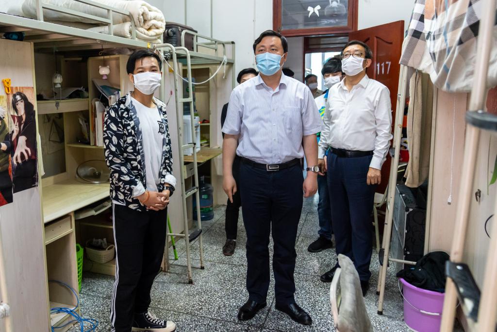 “学校采取了哪些防控措施?”“防疫物资是否齐全?”“外地学生如何顺利返校?”……来到乐山师范学院百果苑学生生活区,张彤走进学生宿舍,关心慰问在乐老挝籍学生的学习和生活,检查宿舍疫情防控措施落实、宿舍人员配备及管理、消杀工作开展情况等;前往校内医学观察区,详细了解工作流程、设施改造、人员配备、服务保障准备工作,实地查看观察区内物资储备、房间设置等。就餐安全是校园疫情防控中的重要一环。来到校内食堂,张彤仔细询问就餐安排、食品安全、环境消杀等措施落实情况。