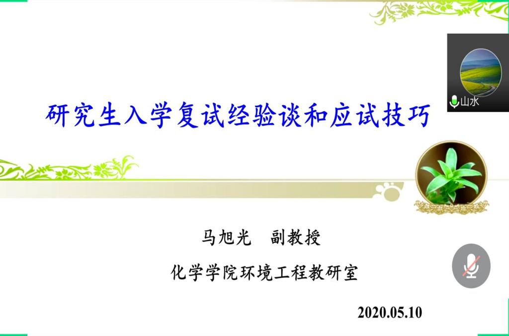 5月11日,化学学院副教授马旭光通过腾讯会议,举办了以“研究生入学复试经验谈和应试技巧”为主题的讲座,向同学们分享了他研究生复试应试的经历,介绍了复试流程,详细讲解了复试的应试技巧。比如面试考察内容、面试前应有的准备,与面试官的交流、英语展示等方面应注意的面试技巧,帮助同学们了解面试中可能遇到的问题和应对方法。