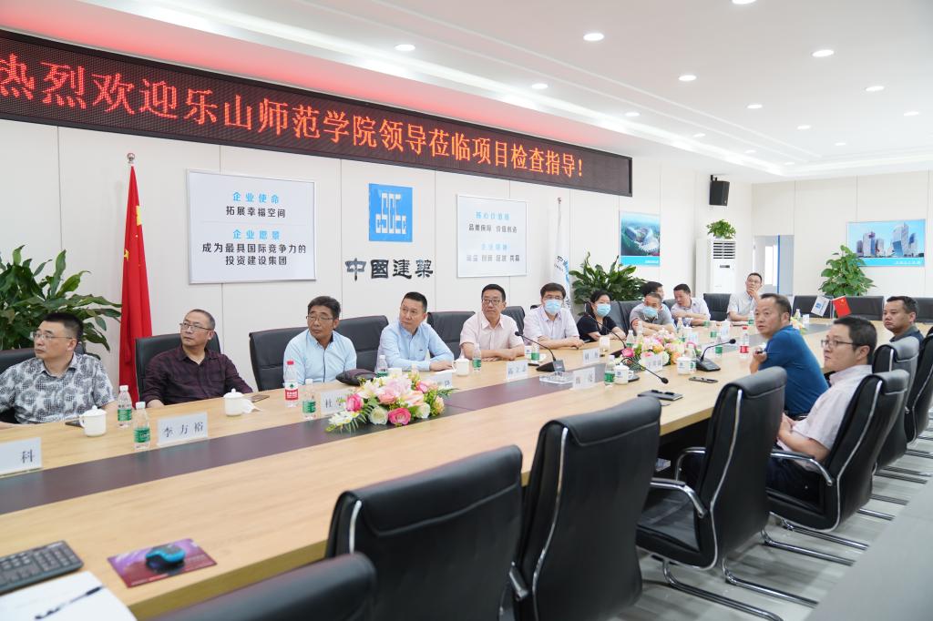 在中建三局乐山奥体中心项目部,校党委班子成员观看了苏稽新区规划建设宣传片,听取了王明曦对新区规划建设的整体介绍,并就我校新校区前期招投标工作、项目规划设计、新校区选址用地、教工宿舍选址和修建方案等情况进行了深入交流。