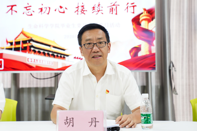 听了毕业生党员的发言,胡丹深情的回顾了他大学毕业时的场景,分享了一个人要取得成功自身应当具备强大的内心、必胜的信念、聪明的大脑、强壮的身体的故事。对毕业生党员在大学四年取得的优异成绩予以充分肯定,对在抗疫期间挺身而出的学生党员高度赞扬,对返校学生党员的辛勤付出表示衷心感谢。最后,他对2020届全体毕业生党员提出了三点希望,一是要志存高远,干事创业有决心。希望学生党员能将个人发展目标与国家富强、民族复兴结合起来,在青年时期,立大志、做大事,对国家、对社会、对工作单位葆有情怀,正确对待人生的逆境,将逆境看作人生的历练,不断促进自己成长成才。二是要担当奉献,为民服务有恒心。希望学生党员传递和弘扬无私奉献的为民服务精神,牢记时代的嘱托,不负人民的信任,永远恪守为人民服务的铮铮誓言,不断增强为民服务的本领,砥砺前行、执着进取,在为人民服务的道路上捷报频传。三是清正廉洁,坚守底线有戒心。希望每一名学生党员踏入社会要牢记自己的初心,尊崇法律权威,严守党规党纪,绝不违规逾矩,绝不踩踏红线。要耐得住寂寞、经得起诱惑,清清白白做事,干干净净做人,要时刻自重、自省、自警、自励,永远不忘共产党人的使命,永远保持清正廉洁的本色。