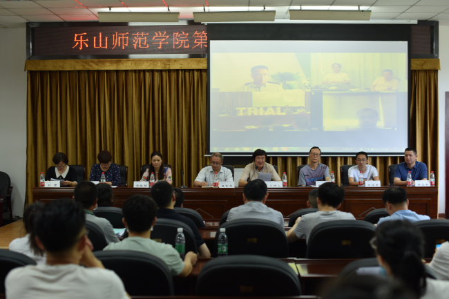 本网讯(文图/黄忠林)6月10日上午,乐山师范学院在弘毅楼312会议室举行西华大学—乐山师范学院联合培养硕士研究生2020届学位论文答辩会。本次答辩采用线上线下结合的方式举行,西华大学副校长费凌、西华大学研究生部和相关教学院领导、答辩专家线上参加答辩会,乐山师范学院副校长杜学元、乐山师范学院科研部领导、相关教学院负责人、答辩专家、导师和答辩学生线下参加答辩会。会议由乐山师范学院科研部陈天柱主持。