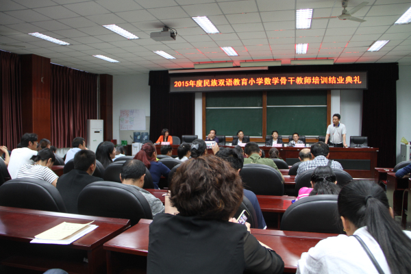 4月27日晚,四川省2015年民族地区双语教育小学数学骨干教师培训班结业典礼在弘毅楼413教室举行。数信学院党总支书记、首席专家邹进、院长汪天飞、副院长李木华、龙述君、党总支副书记王志明以及部分指导教师出席结业典礼,仪式由李木华主持。