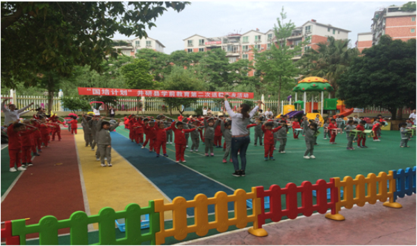 上午,老师们参观井研县机关幼儿园(分园)各班的区域活动,全体幼儿在活泼的音乐伴奏声中开展了丰富多彩的早操活动。幼儿按年龄班分别进行了绳操、板凳操、软棒操和徒手操,随着音乐的转换,幼儿将废旧轮胎、呼啦圈、彩虹伞、软垫、竹梯等材料放置在操场上开始了精彩的体育游戏。随后,机关幼儿园分园谭老师为大家带来了大班体育活动《好玩的软棒》。在整个活动中,幼儿的注意力集中,积极性高,情绪愉快,较好地达成了本次活动的目的。观摩活动结束后,参训学员纷纷发表感慨并提出疑问。刘涛针对学员的提问,引导大家从体育集教活动与体育游戏的区别、动静交替原则的把握、创新,规则与自由的尺度等方面进行深入交流。在解答学员疑问的同时,带领大家对幼儿体育活动进行更进一步的思考。