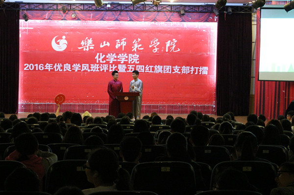 4月14日晚,化学学院在旷怡楼一教八阶举行2016年优良学风班评比暨五四红旗团支部打擂活动。化学学院党总支书记杨泽勇参加此次活动,活动由关工委敖良义老师、化学学院副院长孙国峰、学生科科长李东担任评委,化学学院全体学生参加此次活动。