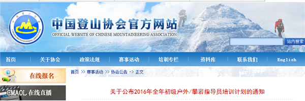 据中登协网站近期公告,《关于公布2016年全年初级户外/攀岩指导员培训计划的通知》,我校体育学院成功取得了2016年初级户外/攀岩指导员培训资格,培训工作将在10月举办。这是体育学院继2015年承办中国登山协会186期初级户外指导员职业认证后,第二次取得培训资格。获得此次培训资格的仅有包括北京体育大学、中国地质大学、北京师范大学、武汉体育学院、沈阳体育学院、成都体育学院、贵州医科大学、广东体育职业技术学院等10余所高校。