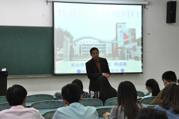 4月28日下午,应特教学院邀请,乐山市特殊教育学校副校长周成燕、教导主任蔡琴在行知楼313为特教学院2013级学生作了试讲试教专题讲座。本次讲座是特教学院本学期试讲试教工作开展以来举行的第三次专题讲座。此次讲座的主题是“聋教育语文课堂教学与聋教育数学课堂教学”。