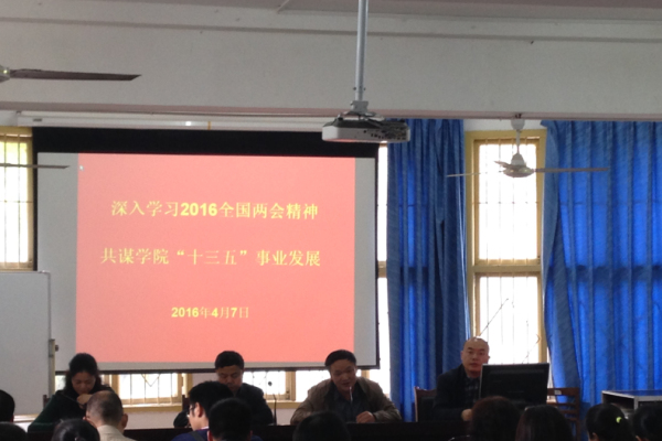 郭学文希望广大教职工认真学习两会精神,并密切结合学术研究、日常教学及地方服务,努力提升工作业务水平,把当下思想政治学习与“十三五”结合起来,推动学院学校各项工作转型升级。郭学文强调,教师要走进学生,要积极参与到学院“十三五”的事业规划中来,也希望老师们积极提出意见和建议,为学院学校的发展共同努力。