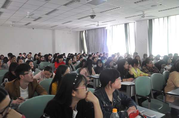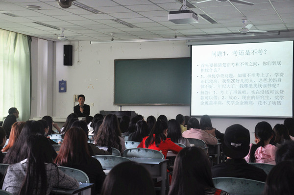 宣讲会一开始,王斌用了一个关于“鱿鱼”该不该“烤”的小故事作为开场白,引出在场同学“犹豫”考不考研的话题。王斌提出考不考研、是选择考专业硕士还是学术硕士、选哪所学校、选什么专业以及何时备考等五大问题,并针对这些问题,结合就业后的工资待遇等相关数据和自身看法一一做了介绍。此外就同学们在选择指导老师和备考学校时出现的“集中选”“热门选”等情况,王斌分析了原因并提出了自己的意见。就记忆力遗忘系数角度而言,王斌主张同学们应一鼓作气地读下去,不赞同就业后再去考研。