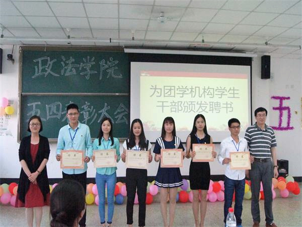 为鼓励共青团员发挥先锋模范作用,激发大学生学习与工作的积极性,大力弘扬五四精神,引导政法青年成长,在五四青年节之际,由政法学院分团委主办的五四表彰大会在行知楼201举行。政法学院院长陈天柱,党总支书记梁清,学生科长、分团委书记周琴,辅导员张雯娟、单敏,以及五大学生机构负责人和团学机构干部、学生们一同参加了此次表彰大会。
