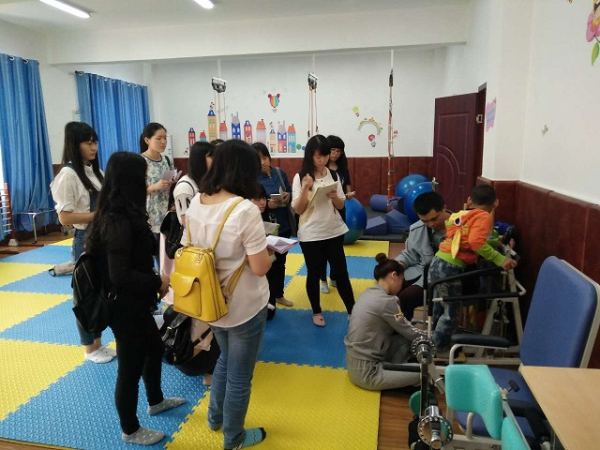 首先,朱德川介绍了乐山市夹江县人民医院康复科第二治疗区的基本情况。夹江县人民医院儿童康复病区(第二治疗区)位于夹江县残疾人综合服务中心,是夹江县残联与夹江县人民医院合作共建,集临床诊断,功能评估,康复治疗,辅具加工于一体的新型的残疾人康复中心。接着,钟挥将同学们分成三个组,进入不同的康复室,由专业康复治疗师带领观摩脑瘫儿童的现场康复,并给学生讲解脑瘫儿童的临床表现,动作评估方法,康复训练计划的制定等相关内容。同时,他还带领学生亲身体验不同的康复器械。学生们认真记笔记,积极思考并与康复治疗师交流。