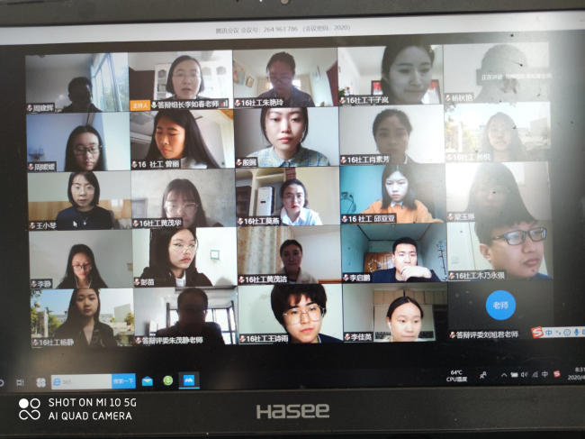 本网讯(文、图/杨文霞)4月22日,政法学院通过腾讯会议屏幕共享与音频通话的方式,组织开展了2020届本科毕业论文第一批次网络答辩,共4个答辩小组,11名教师、76名学生参加了此次答辩会。