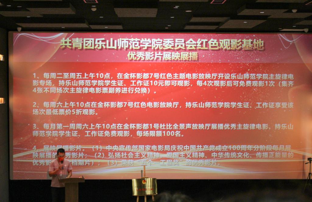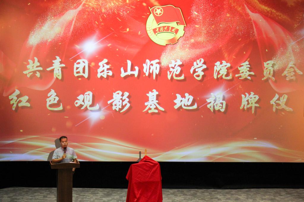 本网讯(文、图/杨蓓蓓)为深入学习贯彻习近平总书记在庆祝中国共产党成立100周年大会讲话精神,发挥红色电影的爱国主义内涵,加强团员青年社会主义核心价值观教育, 9月30日,校团委与金杯影都电影院举行“红色观影基地”挂牌仪式,校团委书记李东、乐山文化产业投资发展有限公司董事长杨秋迟、乐山文化产业投资发展有限公司总经理罗启平以及学生代表参加挂牌仪式。